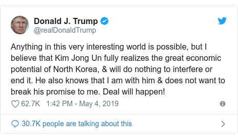 "I believe that Kim Jong-Un fully realises the great economic potential of North Korea and will do nothing to interfere or end it," Mr Trump posted on social media on Saturday.