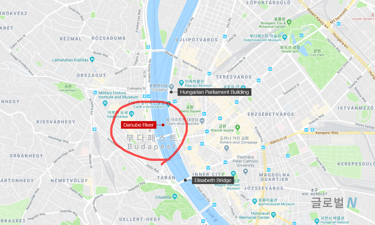 이 배들의 충돌은 헝가리 강가 주변 에리자베스 다리와 의회 건물들이 있는 중심부에서 충돌했다.