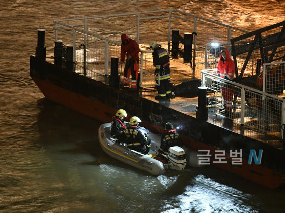 사진설명_구조대원들이 부다페스트 시내 다뉴브 강둑에 모여 있다.